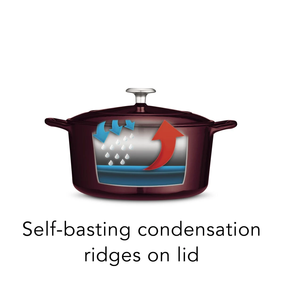 – Self-basting condensation ridges on lid uniformly collect and direct vapors onto food