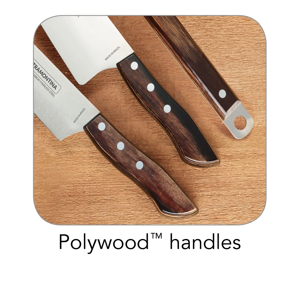 The Tramontina Churrasco bundle includes a 2 Pc Chef”s Knife Set and Grill Fork. The Churrasco 2 Pc Chef”s Knife Set offers essential kitchen cutlery for professional and home cooks. The 8 in and 10 in chef knives feature stain-free, high-carbon steel blades with dark brown polywood handles. The versatile design is suitable for chopping, dicing, mincing, and more, thanks to heat-treated, tapered-ground fine edge blades that ensure precise cutting. The bundle also includes a Tramontina Churrasco Grill Fork with heat-treated, high-carbon stainless steel tines and an ergonomic, polywood handle secured by two solid alloy rivets. Durable and handsome, it”s a must-have for grilling aficionados.