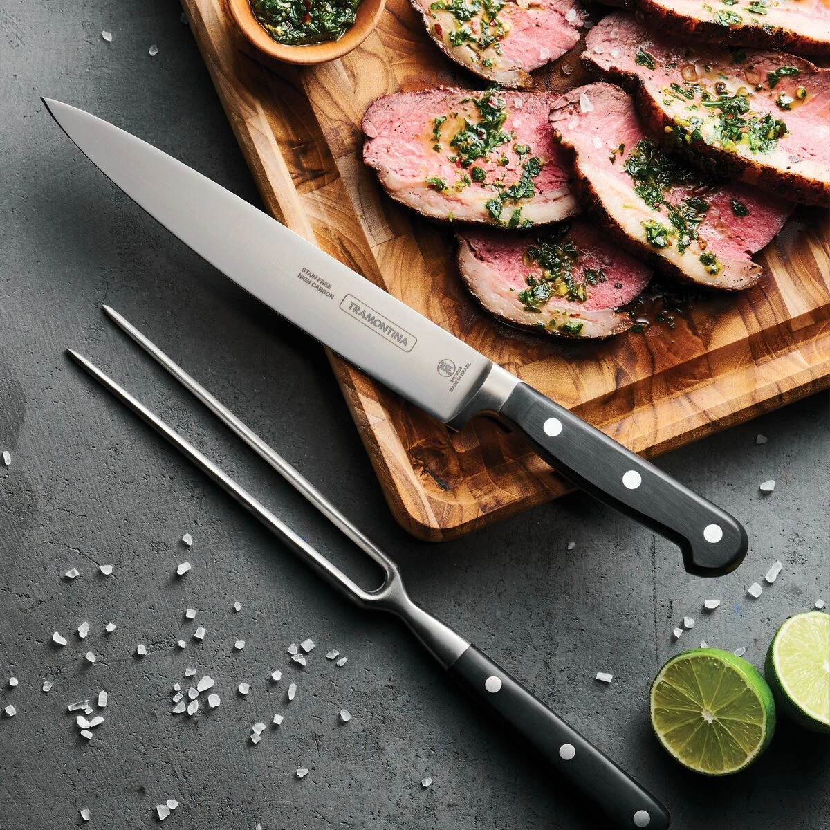 Tramontina”s Gourmet Professional Series 2 Piece Carving Set is ideal for slicing roasts, turkey, chicken, and fish. Each piece is forged from a single solid piece of premium high-carbon stainless steel for unrivaled strength and durability. The blade of the 8-inch carving knife is fully tapered and beveled with a precision-honed fine edge. The heft of the full tang blade, combined with the bolster provide weight and rigidity for safety and superb balance. The design of the handle maintains the traditional style preferred by executive chefs with an ergonomic emphasis on perfect balance and a firm, comfortable grip. Long tines of the carving fork holds larger cuts of meat in place while slicing, and keeps your hands at a safer distance from the blade. Both pieces in the set work together harmoniously to help simplify carving tasks in the kitchen.